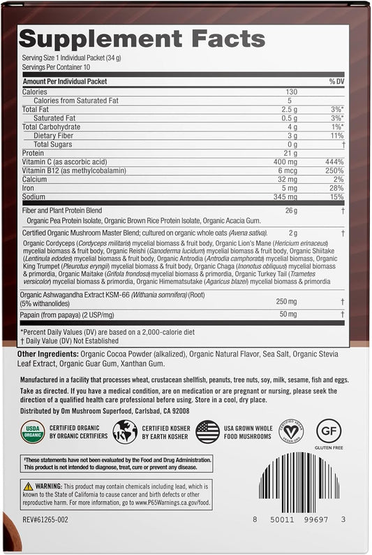 OM Mushroom Superfood Master Blend Single Serve Packets - Creamy Chocolate Plant Protein with Mushrooms & Adaptogens for Energy, Recovery, Stress Relief - 10 Count
