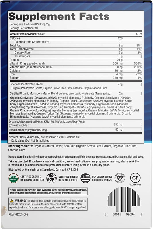 OM Mushroom Superfood Master Blend Vanilla Plant Protein with Mushrooms & Adaptogens - 10 Count, Single Serve Packs - Energy, Recovery, Stress Relief - Lion's Mane, Ashwagandha - 10 Mushroom Complex