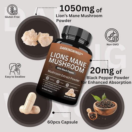 Lions Mane Mushroom Capsules 2100mg - 90 Count, Fruiting Body Extract with Black Pepper for Enhanced Absorption - Vegetarian & Non-GMO
