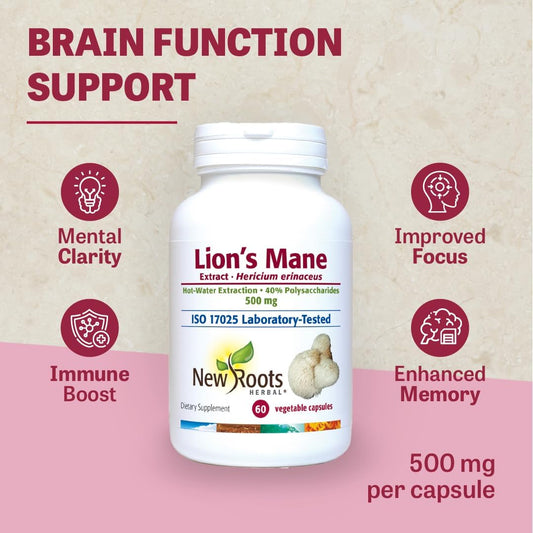 500mg Lions Mane Mushroom Extract Capsules for Memory, Focus & Immune Support | 60 Veggie Capsules by New Roots Herbal