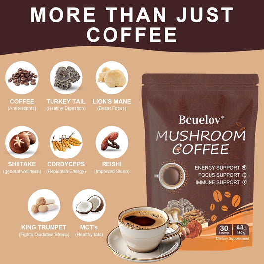Organic Instant Mushroom Coffee with 6 Adaptogenic Mushrooms for Energy, Focus, Digestion & Immune Support