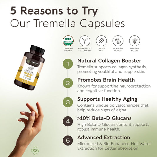 Organic Tremella Mushroom Capsules - Hydrated Skin & Memory Enhancement - 100% Fruiting Body - 120 Capsules