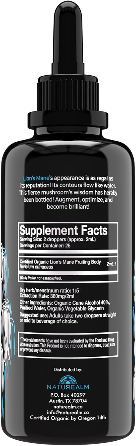 Organic Lion’s Mane Mushroom Liquid Tincture for Focus, Memory & Brain Health - Vegan, Non-GMO Supplement with Fruiting Bodies - 2 Month Supply