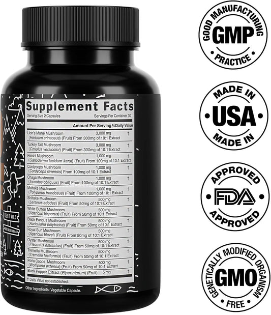 Organic Mushroom Supplement Complex with Lions Mane, Turkey Tail, Reishi & More | Energy, Brain & Immune Support | 10:1 Mushroom Extract (60 Capsules)