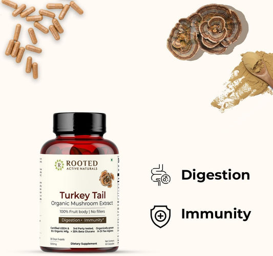 Organic Turkey Tail Mushroom Capsules for Heart Health, Stress Relief, Liver Support - 500 mg, 60 Veg Caps - USDA Certified, 35% Beta Glucans