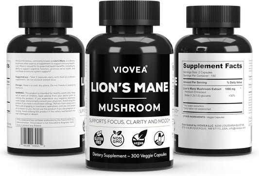 Organic Lion's Mane Supplement Capsules - 300 Capsules (5-Month Supply) for Focus, Memory, and Cognitive Function. Immune Support Nootropic Supplement.