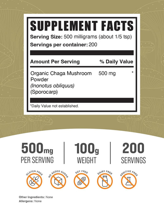 BulkSupplements.com Chaga Mushroom Powder - Organic Mushroom Supplement, Vegan & Gluten Free, 500mg per Serving - 100g (3.5 oz) Pack of 1