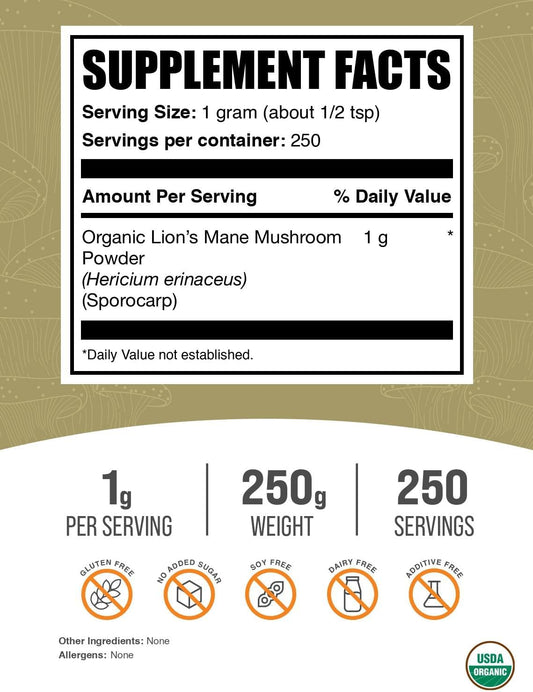 BulkSupplements.com Organic Lions Mane Mushroom Powder - 1000mg per Serving, 250g (8.8 oz) - Gluten-Free Lion's Mane Supplement Powder