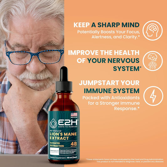 E2H Lion’s Mane Mushroom Extract - Enhances Mental Clarity, Memory & Focus - Immune Support Supplement - Non-GMO, Vegan - (3 Bottles)
