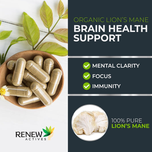 Organic Lion's Mane Mushroom Capsules for Brain Function, Memory, Focus, Stress Relief, Immune Health - 120 ct.