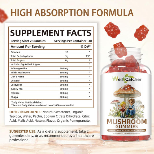 Organic Mushroom Gummies Supplement with Ashwagandha for Memory and Focus - Lion Mane, Reishi, Cordyceps - Vegan Non GMO Mixed Fruit Flavor - 60CT