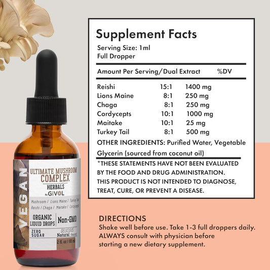 Plant-Based Mushroom Complex Liquid Drops with Vitamin D3 & K2 for Natural Wellness - Vegan Formula with Coconut Oil for Daily Vitality