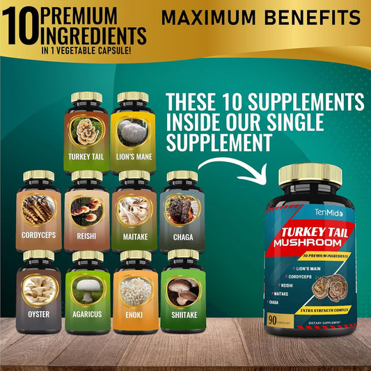 Tenmido Turkey Tail Mushroom Supplement Extract with Lions Mane, Cordyceps, Reishi - 10 Herbs in 1 for Digestive & Immune Support - 90 Day Supply
