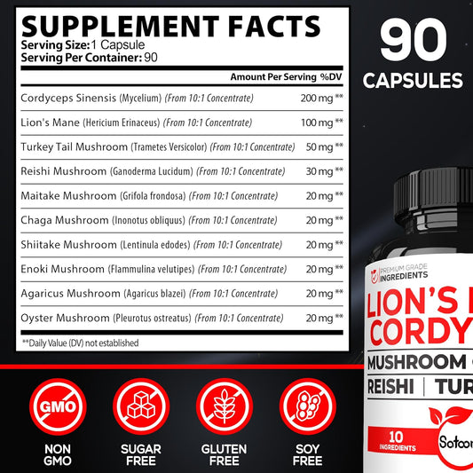 10in1 Cordyceps Mushroom Supplement - Enhanced with Lions Mane, Turkey Tail, Reishi & More - 90 Capsules, 90 Servings