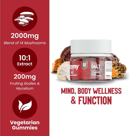60-Count Troomy Daily Mushroom Blend Gummies: Mango Strawberry Flavor, Vegetarian, Gelatin-Free, Gluten-Free
