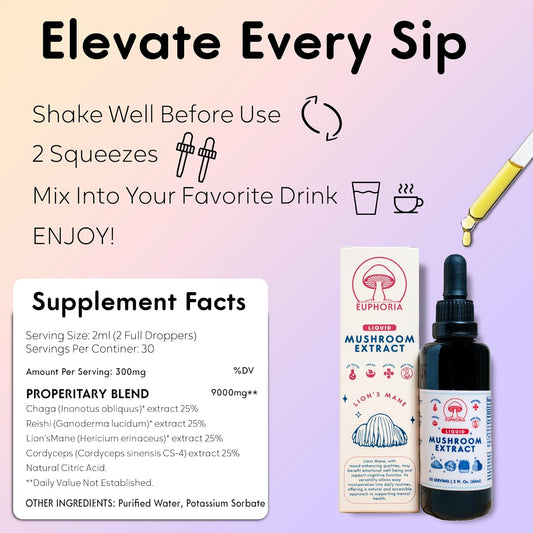 Organic Mushroom Extract Blend with Chaga, Reishi, Lion's Mane, Cordyceps | Vegan & Non-GMO | Supports Wellness & Immunity | 30 Servings, 2 fl. oz.