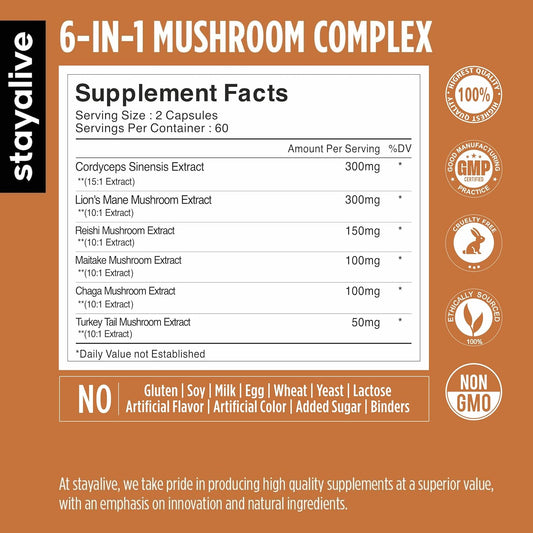 6in1 Mushroom Supplement 1000mg with Lions Mane, Reishi, Cordyceps, Maitake, Chaga, Turkey Tail - 120 Vegan Capsules