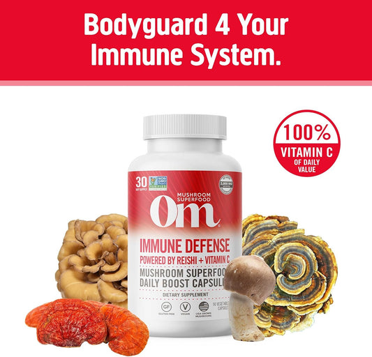 90-Count Om Mushroom Superfood Immune Defense Capsules with Reishi, Turkey Tail, Maitake, and Agaricus Blazei, Vegan Supplement with Vitamin C for 30 Days