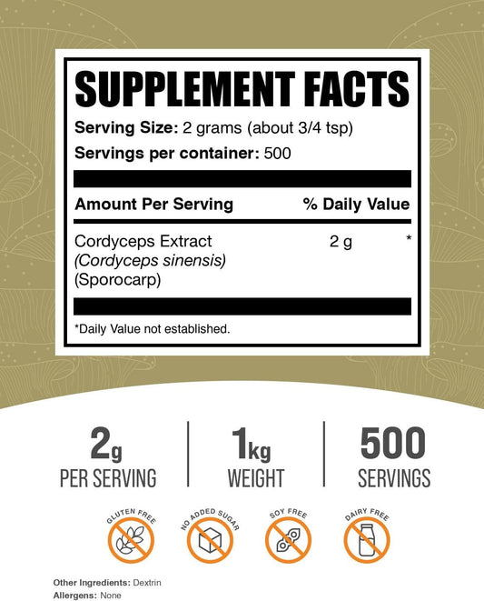 BulkSupplements.com Cordyceps Mushroom Extract Powder - 2000mg per Serving, 1kg (2.2 lbs) - Gluten Free Cordyceps Sinensis Powder Extract - Pack of 1