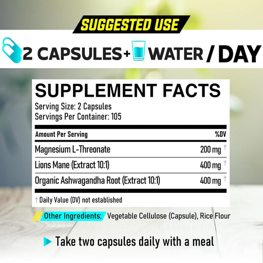 Magnesium L-Threonate Capsules with Lions Mane Mushroom & Ashwagandha Root - 210 Capsules - 1000mg Per Serving - DEDICAD Formula