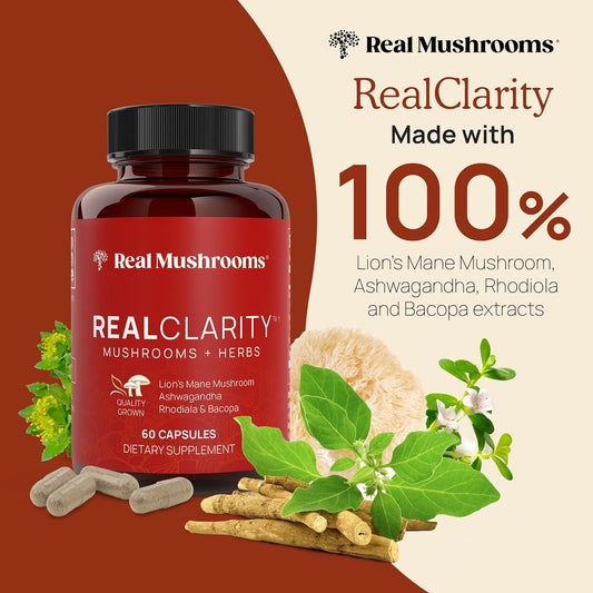 Mushroom Supplement Bundle for Mental Clarity, Focus, Energy - Vegan & Non-GMO - Real Mushrooms RealClarity & Lions Mane Capsules with Cordyceps Powder (60ct & 120ct)