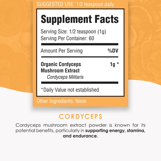 Organic Cordyceps Mushroom Extract Powder for Energy, Stamina & Endurance Support - 60g Purest Mushrooms Cordyceps Powder