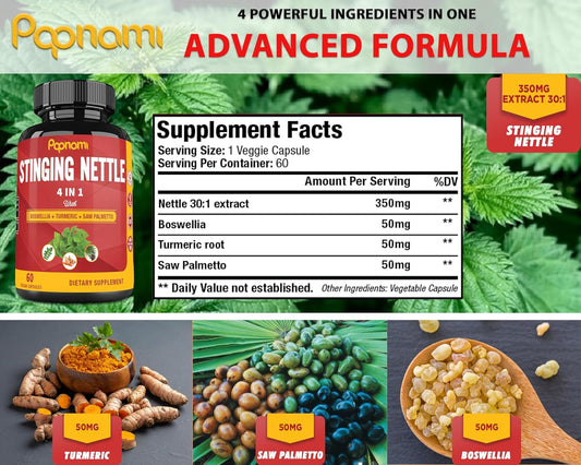2 Month Supply of Papnami Stinging Nettle Extract Capsules with Boswellia, Turmeric, Saw Palmetto for Joint, Body, Skin, Hair, Immunity