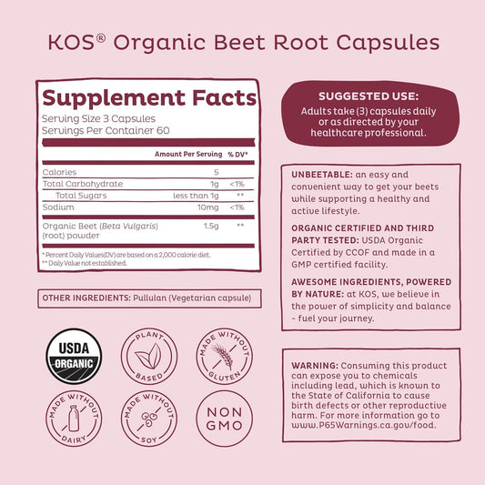 1500mg KOS Organic Beet Root Capsules - Promotes Active Lifestyle - Superfood Powder - 180 Capsules for Health