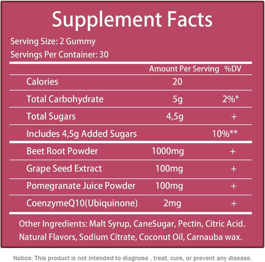 Beet Root Gummies with Nitric Oxide - Berry Flavor, 1000mg, Grape Seed, B12 - 60 Count