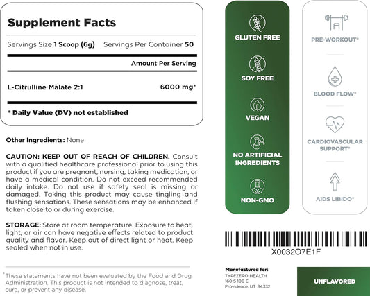 6X Strength Type Zero L-Citrulline Malate Powder (300g, 6000mg per Serving, Unflavored) - Ultra Clean Nitric Oxide Booster for Pre Workout - Vasodilator Supplement