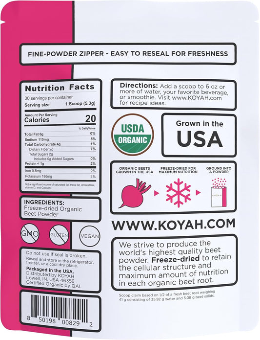 KOYAH Organic Freeze-Dried Beet Powder: USA Grown, Whole-Root, 30 Servings, Add to Water, Juice, or Smoothies
