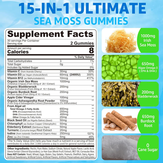 Vegan Sea Moss Gummies with Omega-3, Ashwagandha, Turmeric, Elderberry, Vitamins D3/B12, and More for Immunity and Energy Support - 120 Count