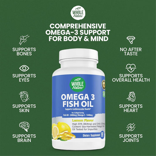 Maximum Strength Whole Nature Omega-3 Fish Oil Supplements, 2400mg, EPA and DHA Fatty Acids, Heart, Brain & Immune Support, Natural Lemon Flavor, 120ct