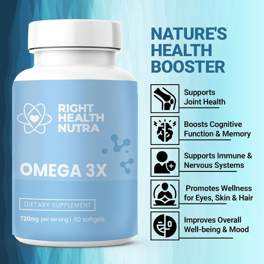 Triple Strength Omega 3 Fish Oil Supplement for Heart, Brain, and Eye Health Support - 60 Burpless Lemon Softgels