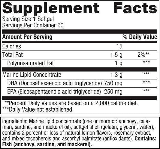 OmegaGenics Neuro Softgels: 1000-750mg DHA, 250mg EPA for Brain & Heart Health - Non-GMO, Gluten-Free, No Fishy Taste - 60 ct
