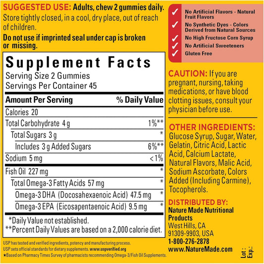 90 Nature Made Fish Oil Gummies with 57mg Omega 3s, Heart-Healthy Softgels in Strawberry, Lemon, & Orange Flavors