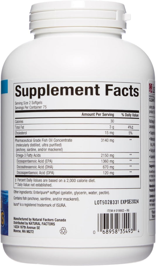 Natural Factors Ultra Strength RxOmega-3 Fish Oil - 2,150 mg Omega-3, High Potency, No Aftertaste - 150 Softgels