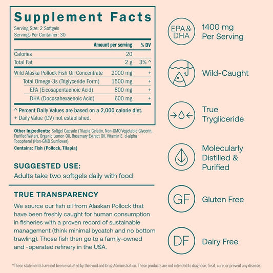 Organic True Grace Omega-3 Fish Oil Softgels - 1400mg EPA + DHA - Supports Brain, Heart, Joint & Immune Health - Gluten and Soy Free - 60 Count