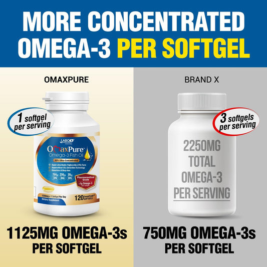 Pharmaceutical Grade LABO Nutrition OmaxPure Omega-3 Fish Oil, 120 Count, 1125mg DHA & EPA, CO2 Extracted rTG Form for Heart, Joint, Brain & Immune Support