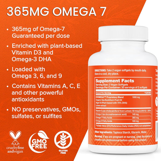 Sea Buckthorn Oil & Plant-Based Vitamin D3 Softgels - Omega-7, Omega-3 DHA (60ct)