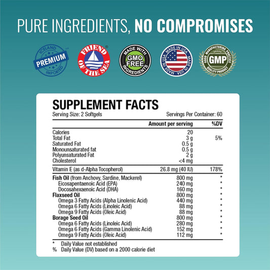 Omega 3-6-9 Daily Blend 2400mg - Fish, Flaxseed, Borage Oils - Vitamin E - Wellness Support - Non-GMO - Mercury-Free - 120 Softgels - 2 Month Supply