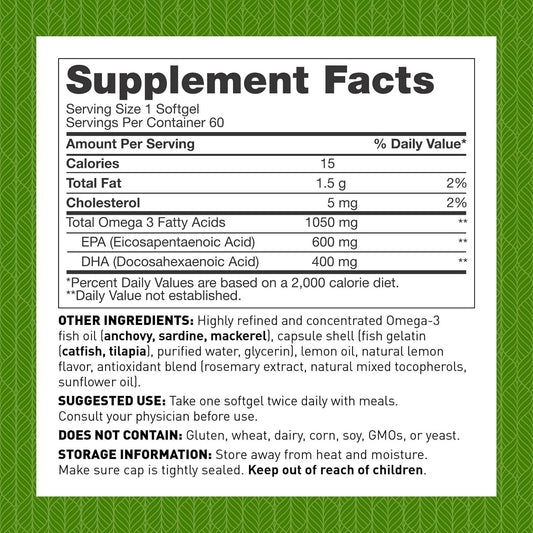 Vitamin Shoppe Omega 3 Fish Oil Softgels - 1100mg, EPA 600mg, DHA 240mg - Cardiovascular, Joint, Brain Health - 60 ct