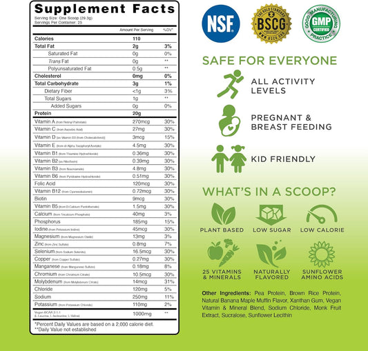 TRU Plant Based Protein Powder with BCAA and EAA, 20g Vegan Protein, 27 Vitamins, No Artificial Flavors - Banana Maple Muffin Flavor - 25 Servings
