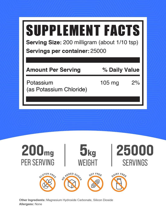 BulkSupplements.com Potassium Chloride Powder - Potassium Salt Substitute, Gluten-Free Supplement, 200mg per Serving, 5kg (11 lbs) Pack of 5Vendor:BulkSupplementsRegular price $334.30 AUDRegular priceUnit price / per-