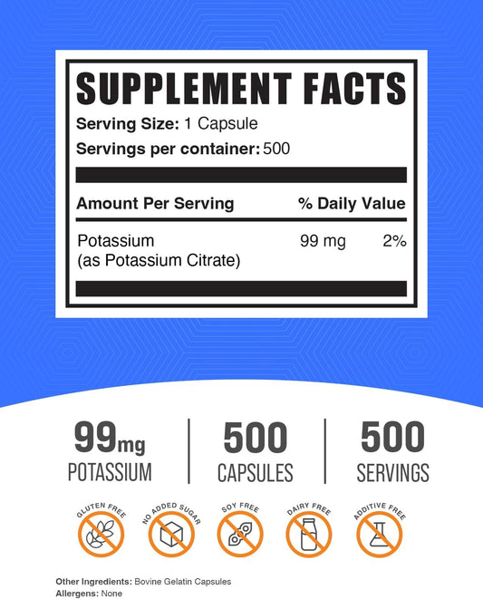BulkSupplements Potassium Citrate Capsules - 99mg Potassium Supplement - 500 Capsules - Single Serving Capsules