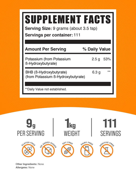 Potassium BHB Powder - Beta-HydroxyButyrate, BHB Salts Supplement - Electrolytes, Gluten-Free, 9g/serving, 1kg (2.2 lbs) - BulkSupplements