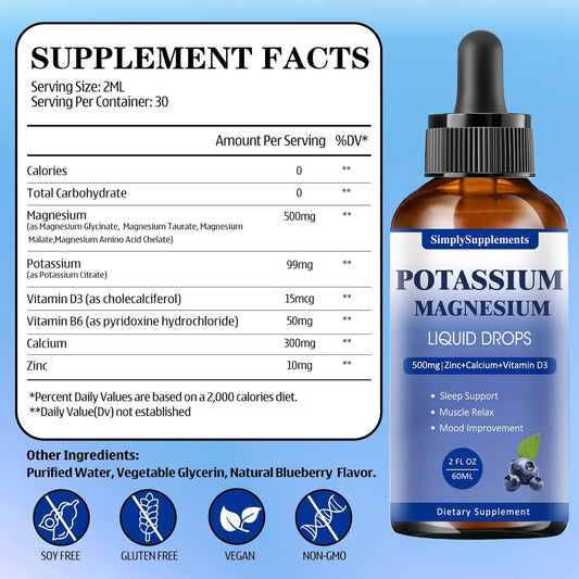 Potassium Magnesium Liquid Drops Supplement with Calcium, Zinc, Vitamin B6 & D3 - Energy, Bone, Muscle Support - 2 Fl ozVendor:SimplySupplementsRegular price $107.34 AUDRegular priceUnit price / per-