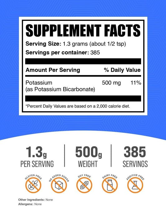 BulkSupplements.com Potassium Bicarbonate Powder - Food Grade Potassium Supplement - 500g (1.1 lbs) - 1300mg per Serving - Pack of 1Vendor:BulkSupplementsRegular price $119.62 AUDRegular priceUnit price / per-