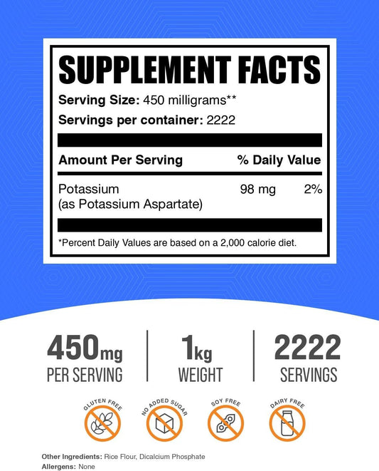 Potassium Aspartate Powder Supplement - 1kg (2.2 lbs) Gluten Free Potassium Supplement 450mg per ServingVendor:BulkSupplementsRegular price $192.12 AUDRegular priceUnit price / per-