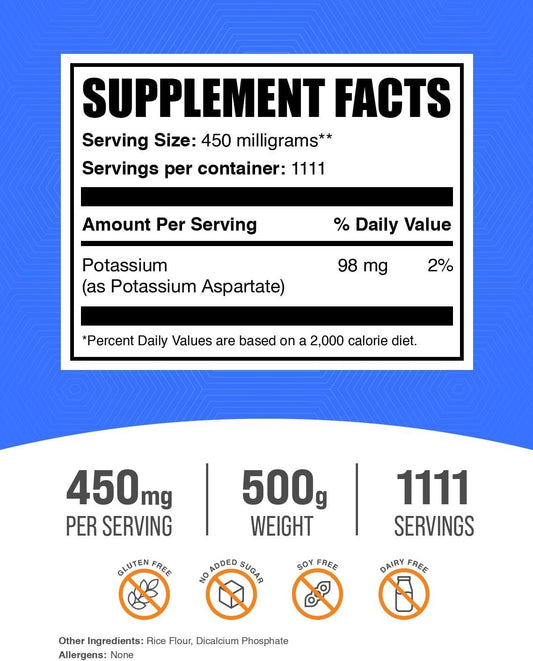 Potassium Aspartate Powder Supplement - Gluten Free, 450mg (98mg Potassium) per Serving - 500g (1.1 lbs) Pack of 1 - BulkSupplements.comVendor:BulkSupplementsRegular price $150.73 AUDRegular priceUnit price / per-